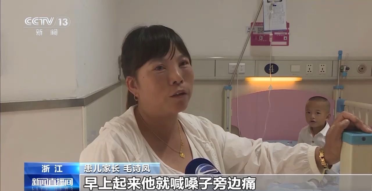患儿家长 毛诗凤:早上起来他就喊嗓子旁边痛,张开嘴巴一看里面有很多疱,我们就到医院来了。从昨天才刚刚开始吃饭,前面两三天连水都不喝。