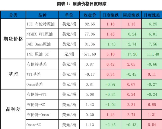 期货价格:ice 布伦特 82.65 美元/桶( 1.18); nymex wti 77.86 美元/桶( 1.45);上海能源(600508)sc 585.7 元/桶( 8.3)。隔夜外盘原油明显反弹。