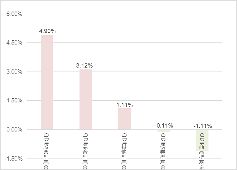 qdii 基金本周涨跌互现,股票型涨幅最大,平均涨幅为4.90%,混合型和其他型紧随其后,平均收益均在1%以上;商品型表现垫底,平均跌幅均为1.11%。