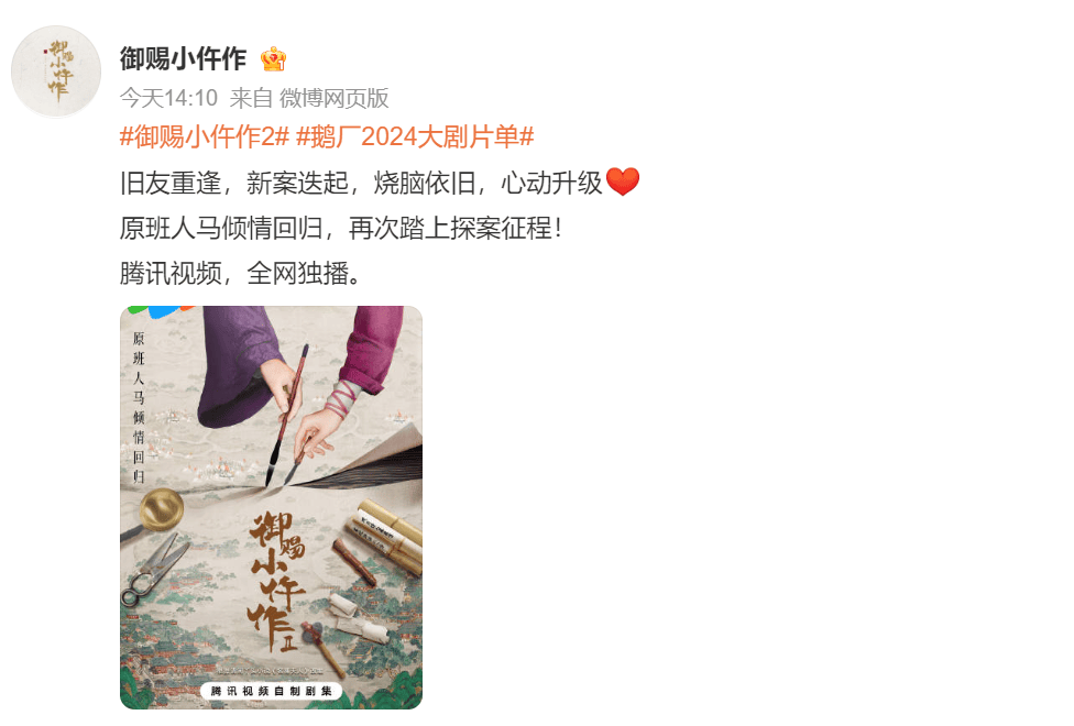 随着新海报的发布和原班人马的回归消息,观众对《御赐小仵作2》的期待值已经达到了一个新的高度。剧组的精心筹备和演员们的倾情演绎,相信将为观众带来一次难忘的探案之旅。让我们共同期待这部作品的播出,再次感受那份紧张刺激的探案氛围。