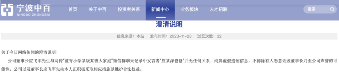 当日晚间,宁波中百连环夺宝官网发布澄清说明称,公司董事长应飞军先生与网传“蓝青小学某级某班大家庭”微信群聊天记录中发言者“应某洋爸爸”并无任何关系,纯属虚假造谣信息,不排除有人恶意诋毁董事长乃至公司声誉的可能性。公司以及董事长应飞军先生本人正积极采取相应措施以维护合法权益。
